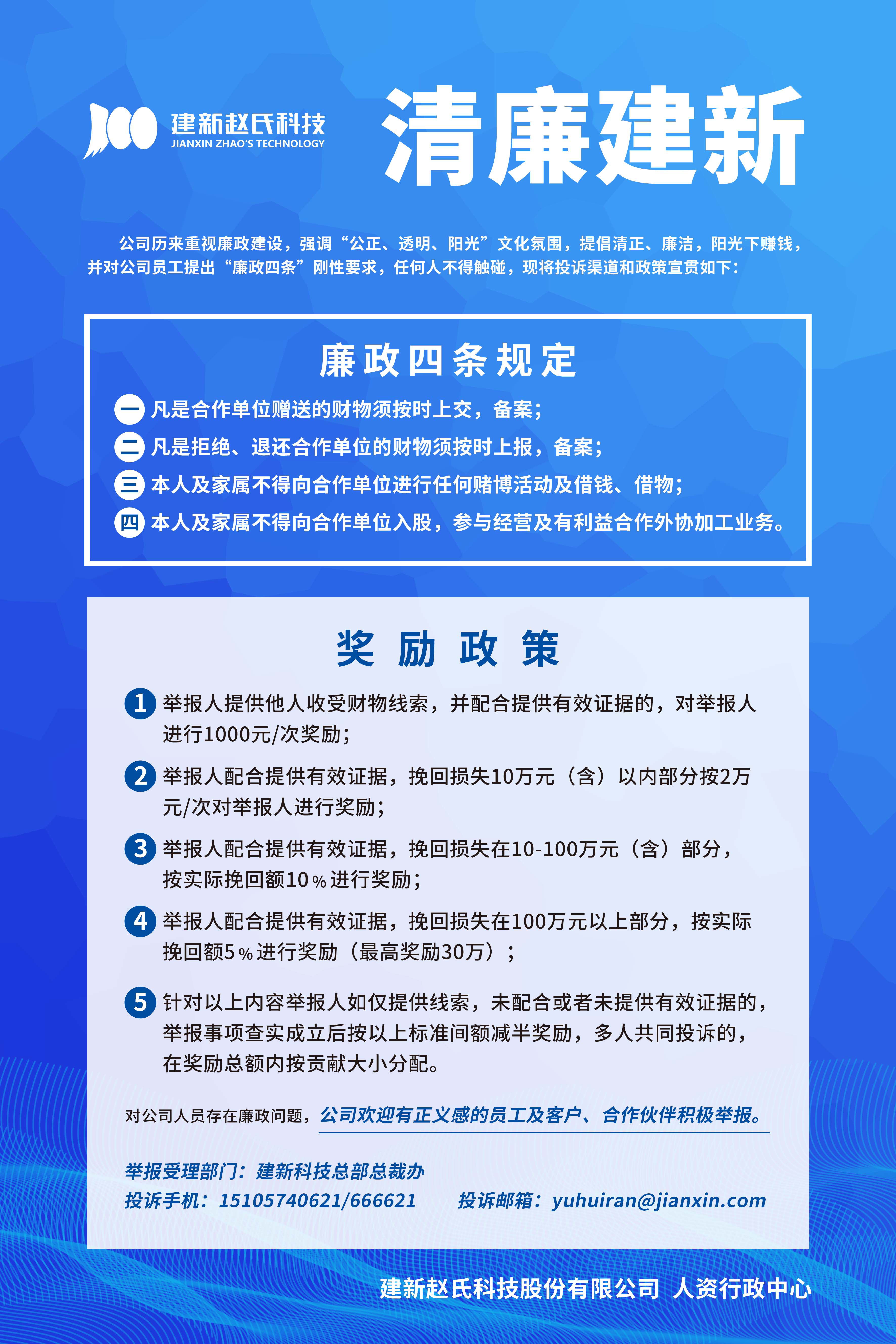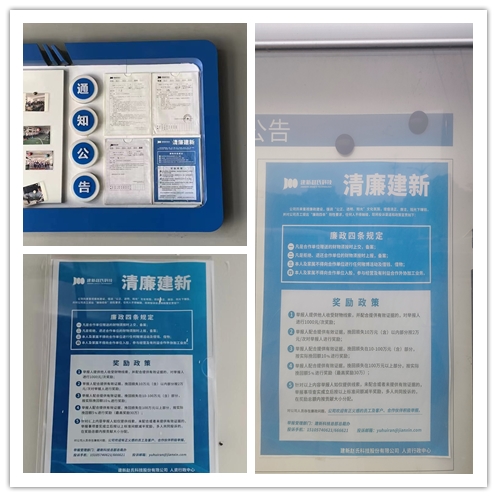 為進(jìn)一步促進(jìn)公司廉政建設(shè),強(qiáng)調(diào)“公正、透明、陽光”的文化氛圍,提倡清正廉潔,建新對(duì)公司員工提出“廉政四條”剛性要求,并大力開展廉政宣傳活動(dòng),在OA、各子公司櫥窗/宣傳欄進(jìn)行線上、線下同步宣傳。